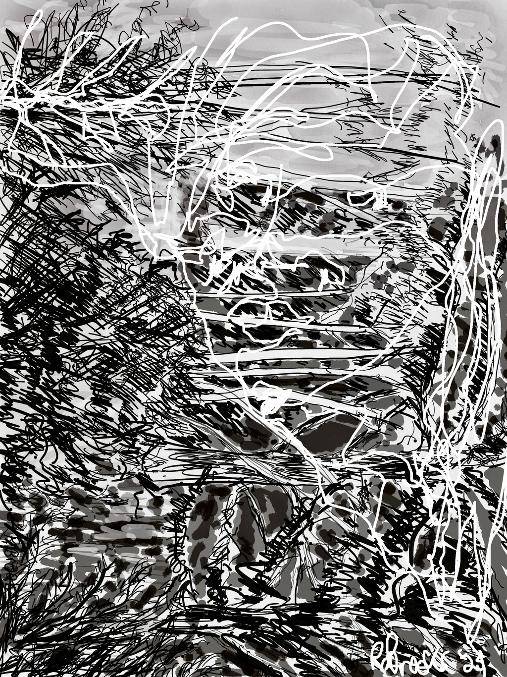 "Palm Desert, Olive Tree BW, #122BW" digital re-work of brush & sepia ink 14" x 17"